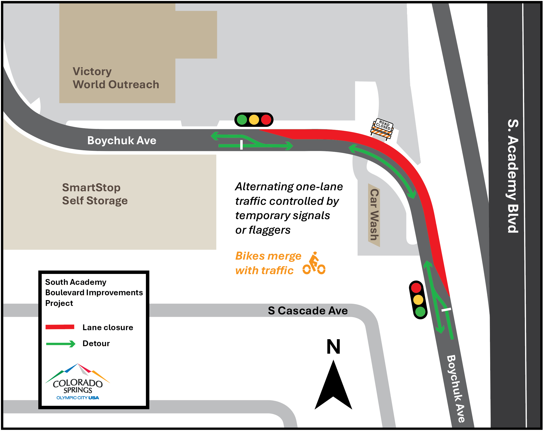 Beginning in April, Boychuk Avenue will be reduced to alternating one-lane traffic controlled by temporary signals or flaggers. The bike lane will be closed in this area and bicyclists will need to merge with traffic. This work will last approximately two months and is necessary for prep work for the tie-in of Boychuk Avenue to S. Academy Boulevard. Please be careful when exiting and entering Colorado Car Wash located southwest of Boychuk Avenue. In addition, the Victory Outreach parking lot southeast exit will be closed during this work. View detour map.