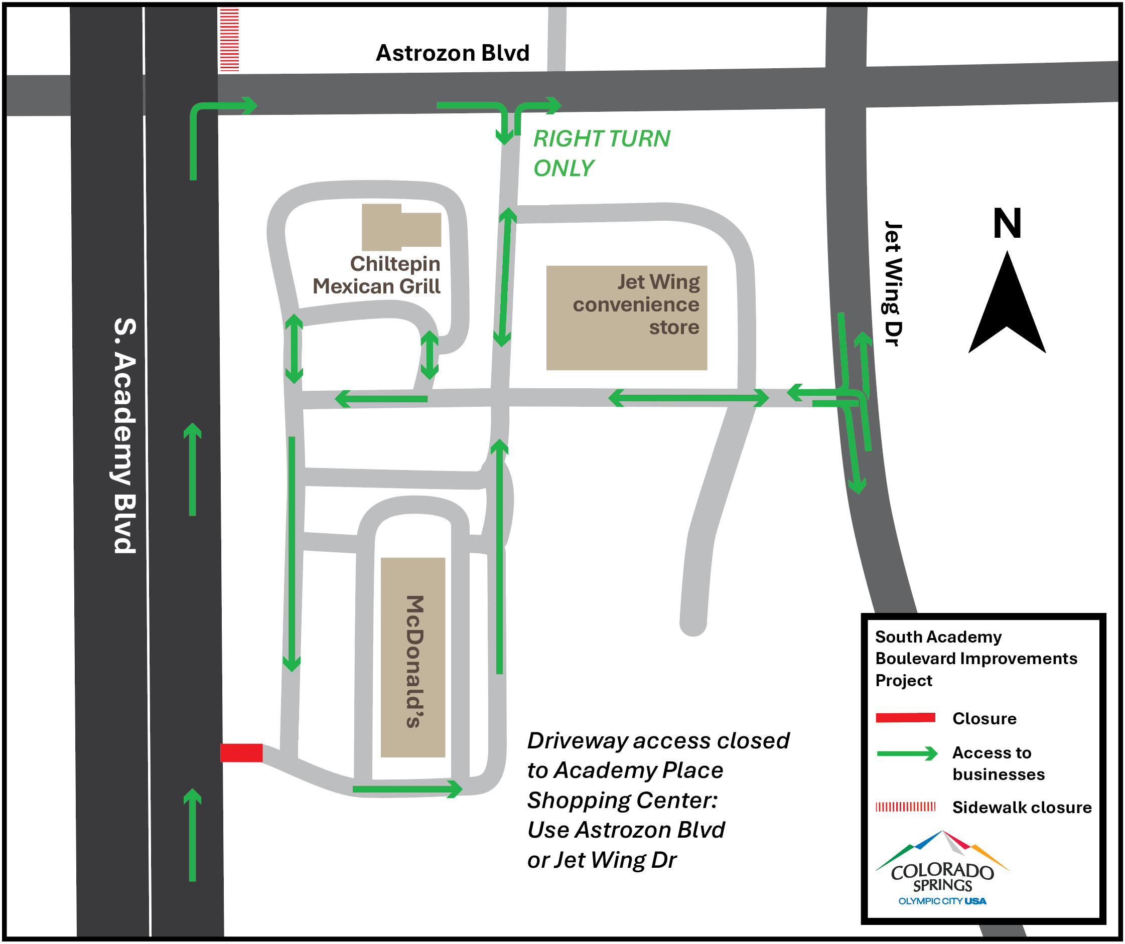Beginning the morning of Monday, April 6, 2026, the McDonald’s driveway at Academy Place Shopping Center (2515 S. Academy Blvd) will be closed from northbound South Academy Boulevard for approximately two weeks (weather dependent). This closure is necessary to excavate a trench approximately 14 feet deep, place watermain pipe, and restore the curb, gutter, and pavement. Businesses at Academy Place Shopping Center remains open and accessible during construction. Customers may access the restaurant via Astrozon Boulevard (right turn only from S. Academy Blvd) or Jet Wing Drive. View detour map.